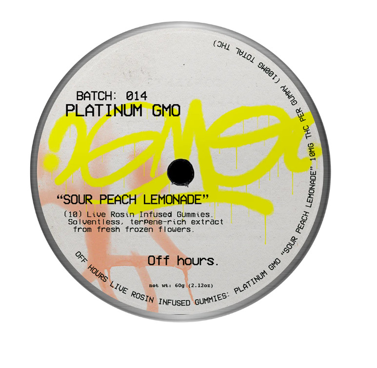 Slip into warm weather and unwind with Off Hours Platinum GMO “Sour Peach Lemonade” Live Rosin gummies. These refreshing and relaxing gummies pair savory and floral Platinum GMO with bright, summery peach lemonade for the perfect chilled out high.