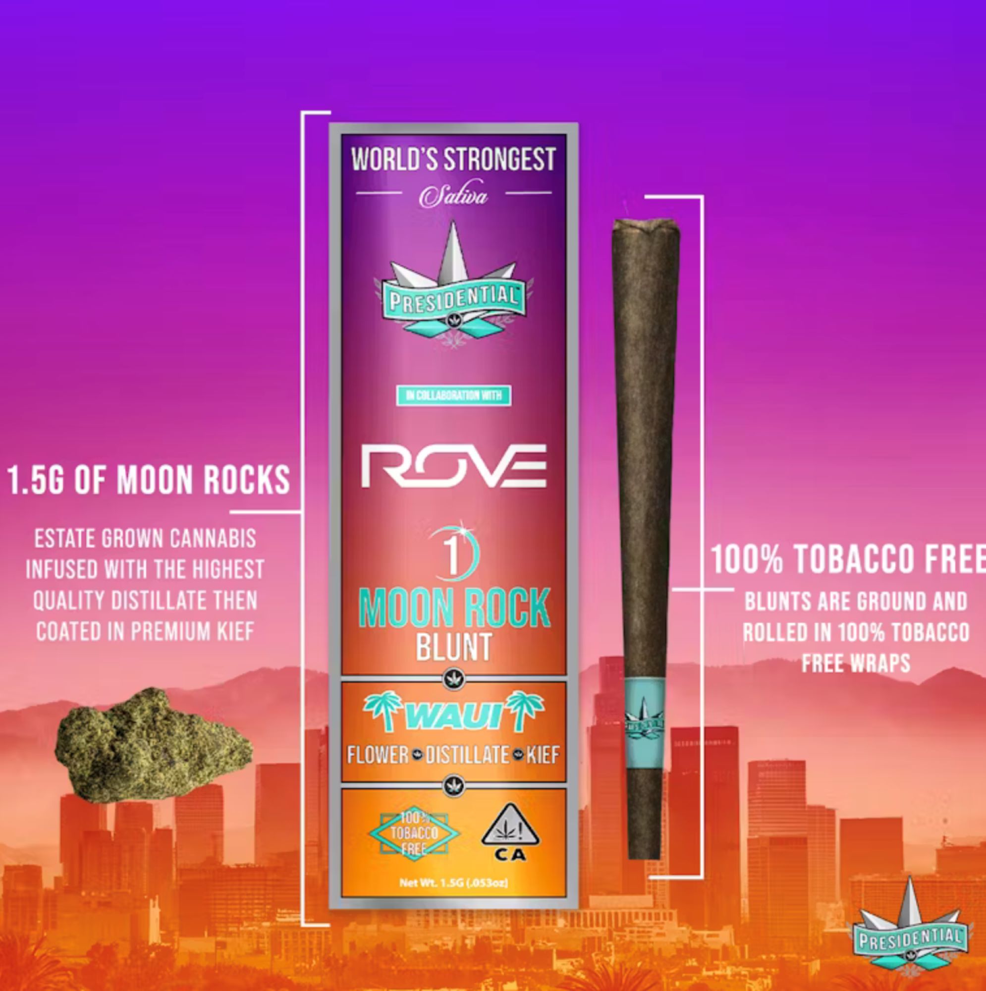 Your Presidential Moon Rock Blunts consist of estate grown, single sourced flower. The flower is then INFUSED with premium distillate formulated by award winning manufacturer Rove, using Presidential’s proprietary infusion process that enables us to permeate the flower to the stem. Finally, it is coated in the highest quality kief, creating the slowest burning, most potent Moon Rocks on the market! Our blunts are ground and rolled in 100% tobacco free wraps for your enjoyment! Waui is a vacation in every puff!