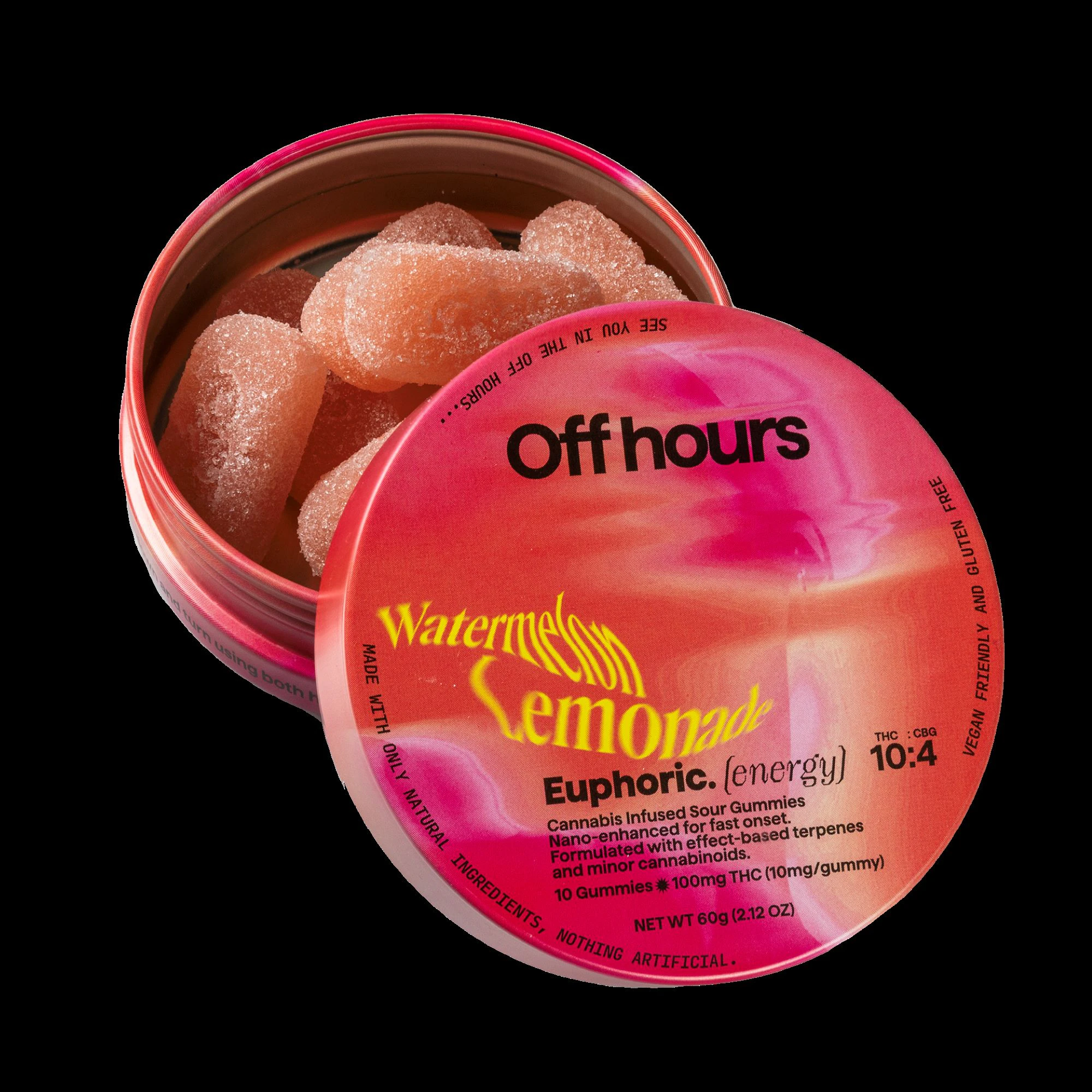 Flavor: watermelon lemonade (sour) Terpenes: special blend for energy Size: 10ct Strength: 100mg THC (10mg/serving) + 40mg CBG (4 mg/serving) Experience euphoria with Off Hours sour watermelon lemonade gummies, infused with an energizing blend of THC and CBG. Nano-enhanced cannabinoids for fast onset. Vegan friendly and gluten free.